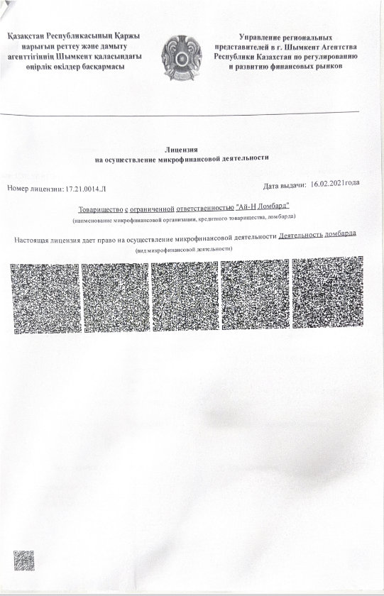 | Қарыз берушінің атауы "Ай-Н Ломбард" ЖШС (бұдан әрі – Ломбард). | Наименование Займодателя (далее – Ломбард) – ТОО "Ай-Н Ломбард". | ||||||||||||||||||||||||||||||||||||||||||